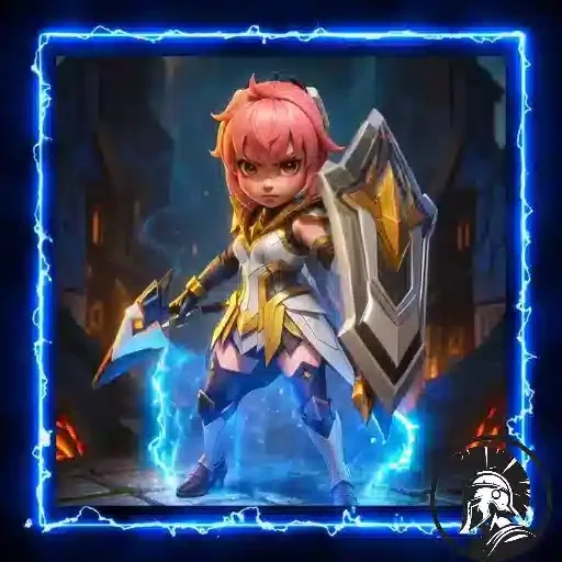 Uma personagem de anime com cabelo rosa e olhos azuis, vestida com armadura e capa, com raios azuis ao fundo.