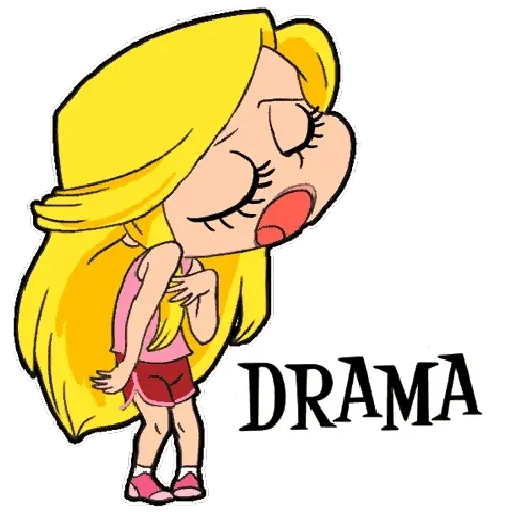 Uma menina de cabelo loiro e vestido rosa fazendo uma careta de drama, com a palavra 'DRAMA' escrita ao lado.