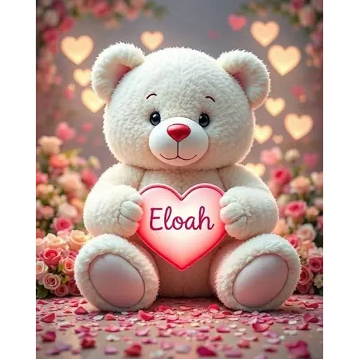 Um ursinho de pelúcia branco com um coração rosa brilhante que diz 'Eloah' no centro, cercado por flores e corações.