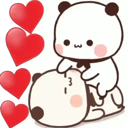 Um ursinho branco com orelhas pretas e bochechas rosadas está ao lado de outro ursinho, com vários corações vermelhos ao redor.