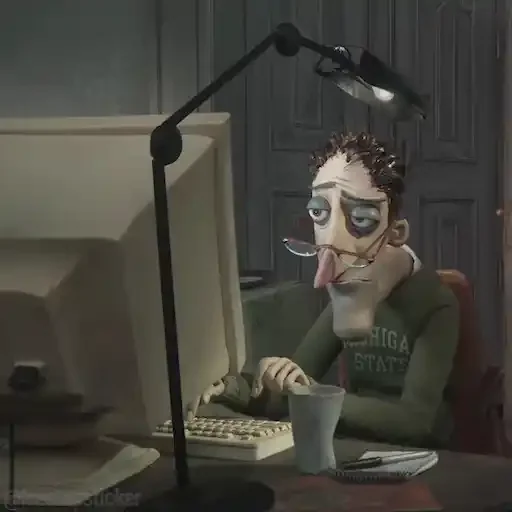 Um homem cartoon sentado em frente a um computador com uma expressão de surpresa ou preocupação, dedo no queixo e olhos arregalados.