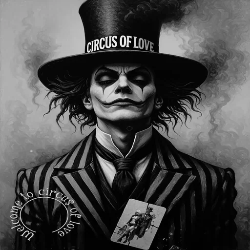 Um homem com maquiagem de esqueleto, usando um chapéu alto com a inscrição 'CIRCUS OF LOVE', um terno listrado e uma carta de baralho. O fundo é cinza com efeito de fumaça.