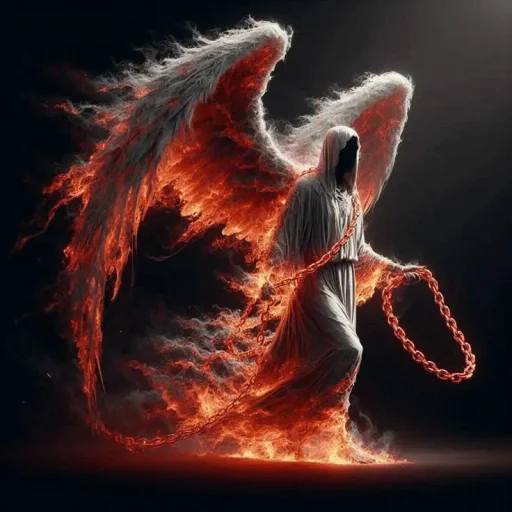 Um anjo com asas grandes e inflamadas, vestido com um manto, segura uma corrente vermelha enquanto enfrenta um fundo escuro com luz intensa.
