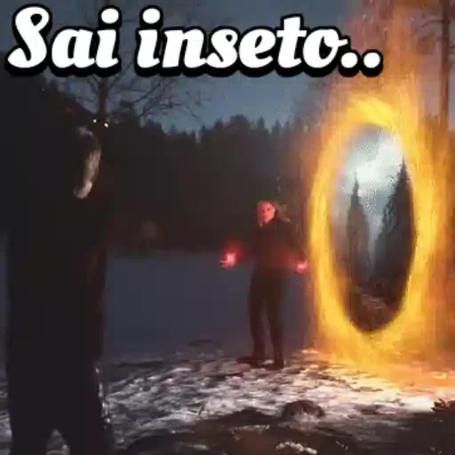 Um homem em frente a um portal de fogo com outro homem ao fundo, com a frase 'Sai inseto..' em destaque.
