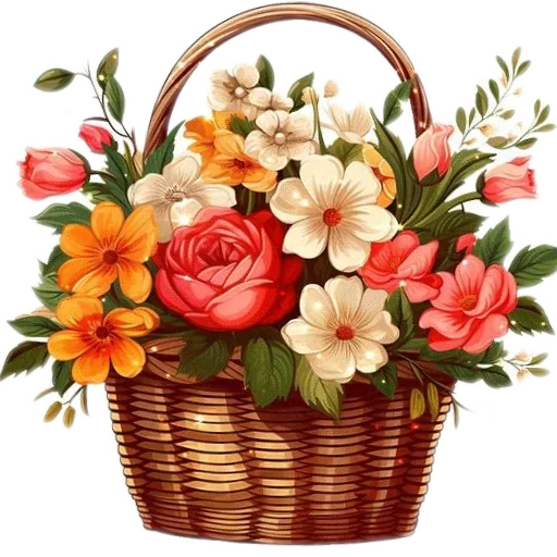 Cesta de flores coloridas com rosas, gladíolos e outras flores, em tons de laranja, rosa e branco, com folhas verdes.