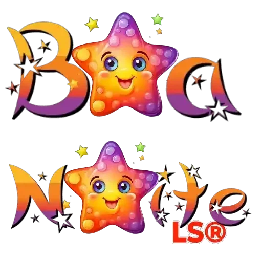 Uma estrela colorida com expressão feliz, rodeada de estrelas menores e texto que diz 'Boa Noite'.