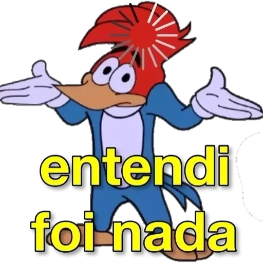 Um cartoon de um pássaro com penas vermelhas na cabeça, vestindo um pijama azul, com as mãos abertas e a expressão surpresa. Abaixo dele, está escrito 'entendi foi nada' em amarelo.