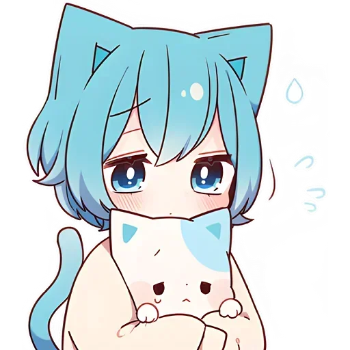 Uma menina de cabelo azul com orelhas de gato e um gato branco está com expressão triste e chorando.