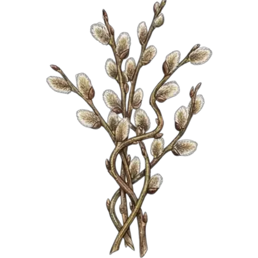 Um ramo de flores ou brotos, com várias pequenas flores ou botões de cor verde e rosa.