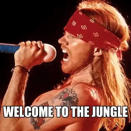 Homem com bandana vermelha e cabelo loiro cantando em um microfone com o texto 'WELCOME TO THE JUNGLE' na parte inferior.