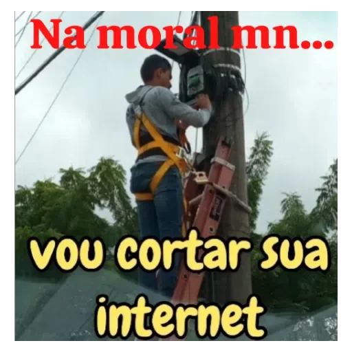 Um homem de capacete e cinto de segurança laranja sobe uma escada para trabalhar em um poste de energia elétrica. Ele veste uma jaqueta cinza e calça jeans. O texto 'Na moral mn... VOU cortar sua internet' aparece em vermelho e amarelo.