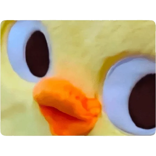 Rosto de um pato amarelo com olhos grandes e bico laranja, parecendo surpreso ou confuso.