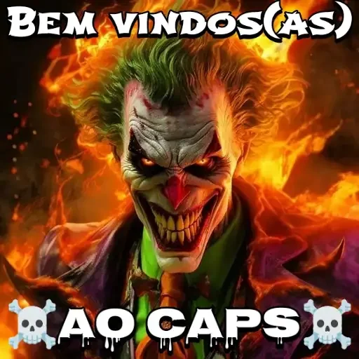 O Coringa com uma expressão maligna e cabelos verdes, cercado por chamas, com o texto 'BEM VINDOS(AS) AO CAPS' em letras brancas.
