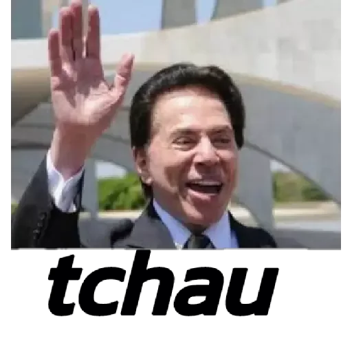 Um homem de terno acenando com a mão direita, com o texto 'tchau' embaixo. Ele tem cabelo preto e parece estar sorrindo.