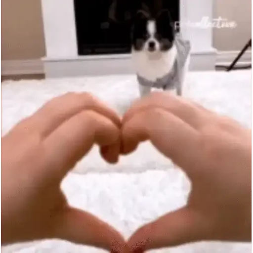 Mãos formando um coração com um cachorro preto e branco ao fundo, que parece estar usando um suéter cinza.