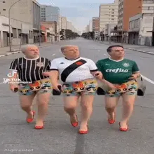 Três homens com aparência de idosos, vestidos com shorts coloridos e camisetas diferentes, caminhando por uma rua urbana. Eles parecem estar dançando ou se exercitando.