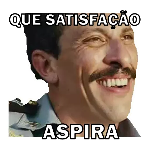 Um homem com bigode e um sorriso forçado, com texto 'QUE SATISFAÇÃO ASPIRA' sobreposto.