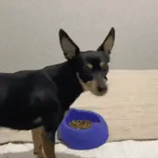 Cachorro preto com orelhas grandes e focinho castanho claro ao lado de uma tigela azul com ração.