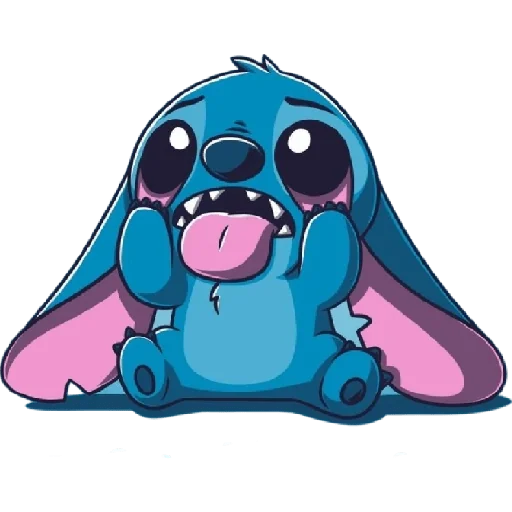Stitch, o personagem de Lilo & Stitch, sentado no chão com uma expressão triste e um palito na mão, com lágrimas no…