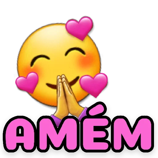 Um emoji amarelo com as mãos juntas em oração e corações rosa ao redor, com a palavra 'AMÉM' em letras rosa abaixo.