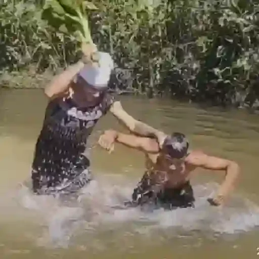 Dois homens estão na água, um usando uma camisa preta e uma touca branca, e o outro sem camisa e com touca preta. O homem com a camisa preta parece estar agitando um objeto na mão.
