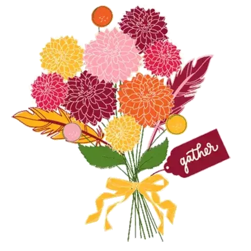 Um buquê de flores coloridas com folhas e um laço amarelo, com um cartão que diz 'gather'.