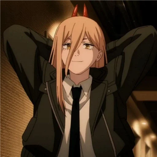 Personagem de anime com cabelo laranja e chifres vermelhos, vestindo um blazer preto e gravata preta, com expressão facial relaxada.