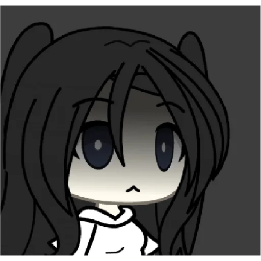 Uma menina de anime com cabelo preto e olhos grandes e tristes. Ela está vestindo uma blusa branca.