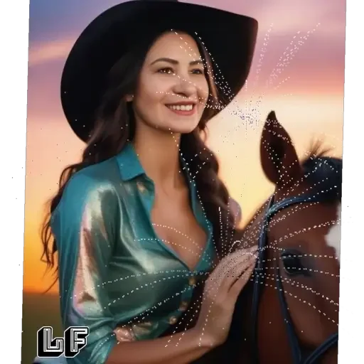 Uma mulher com um chapéu preto e uma camisa verde brilhante acaricia um cavalo marrom ao pôr do sol.