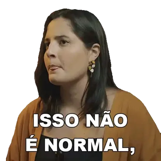 Mulher com expressão séria e olhar lateral, vestindo um suéter laranja e um top preto. A frase 'ISSO NÃO É NORMAL,' aparece em destaque na parte inferior.