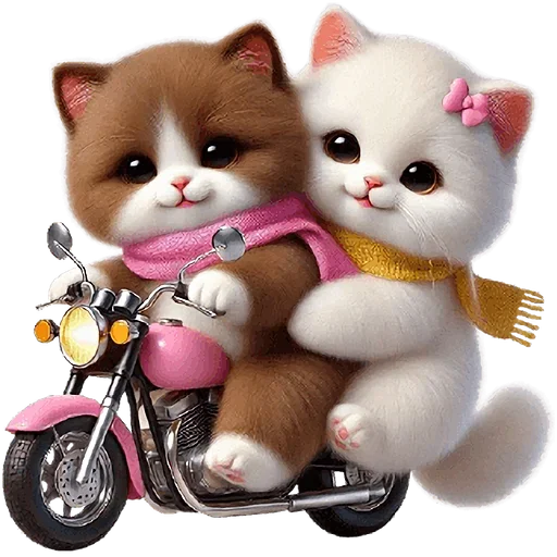 Dois gatos fofos, um castanho e um branco com laço rosa, estão sentados em uma motocicleta rosa. O gato castanho parece sério enquanto o gato branco sorri.