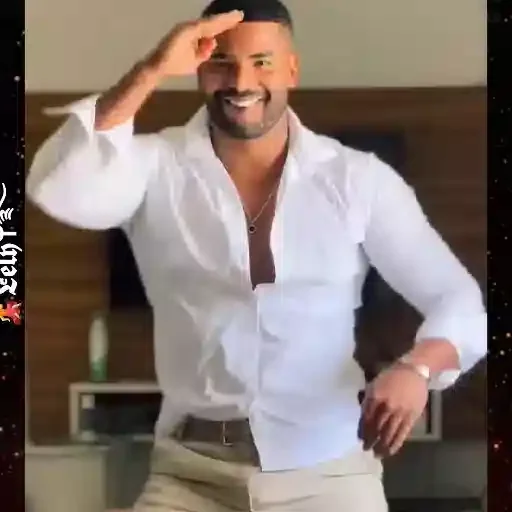 Homem de camisa branca e calça bege fazendo um gesto com a mão, com um sorriso no rosto.