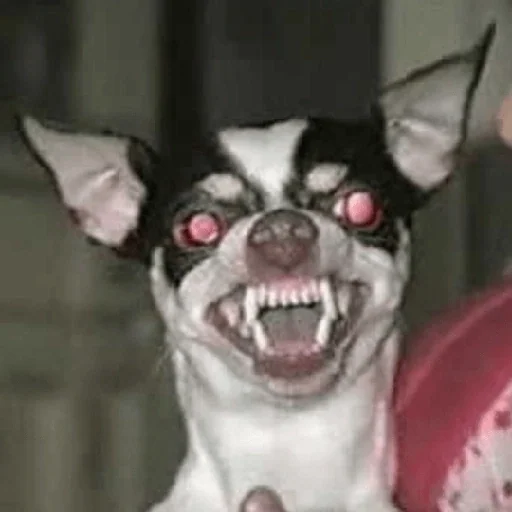 Cachorro Chihuahua com olhos vermelhos e dentes arreganhados, parecendo zumbi ou possuído.