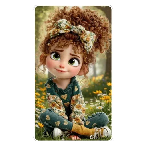 Menina com cabelo castanho encaracolado e faixa na cabeça sentada em um campo de flores amarelas e brancas. Ela está usando uma roupa verde com flores e meias brancas.