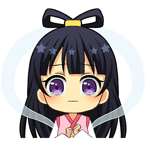 Garota de olhos roxos e cabelos pretos com expressão triste ou surpresa, vestindo uma roupa rosa com detalhes em vermelho.