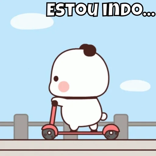 Um personagem de desenho animado, um animal branco com uma marca marrom no topo da cabeça e bochecha rosa, está andando de scooter vermelha ao longo de uma cerca, com o texto 'ESTOU INDO...' acima.