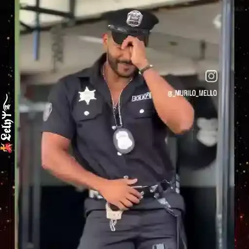 Um homem vestido de policial com o rosto coberto, parecendo suado e exausto, com a mão no rosto e outra na cintura, usando um crachá e um cinto com uma arma.