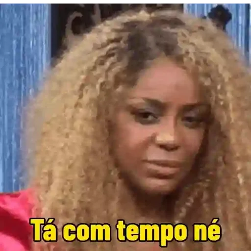 Rosto de uma mulher com cabelo loiro encaracolado e expressão facial séria. Ela está com uma roupa rosa e o texto 'Tá com tempo né' aparece em amarelo na parte inferior da imagem.