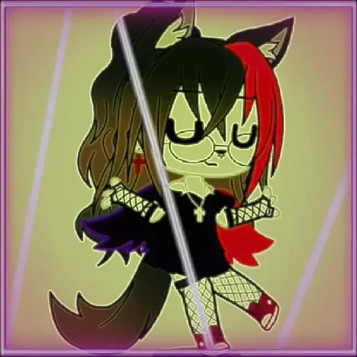 Uma personagem de anime com cabelo preto e vermelho, vestida de preto, com uma cauda e orelhas de raposa, empunhando uma espada.