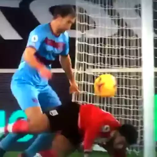 Jogador de futebol em azul observa a bola amarela voando para o gol enquanto adversário em vermelho e preto cai no chão.