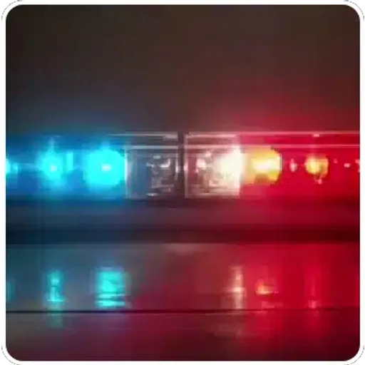 Sirene de polícia com luzes azuis e vermelhas acesas à noite, refletindo em uma superfície molhada.
