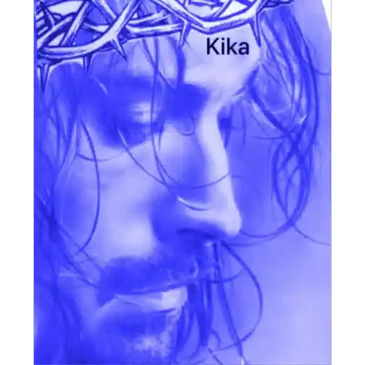 Rosto de Jesus Cristo com coroa de espinhos, efeito azul, texto 'Kika' no topo.