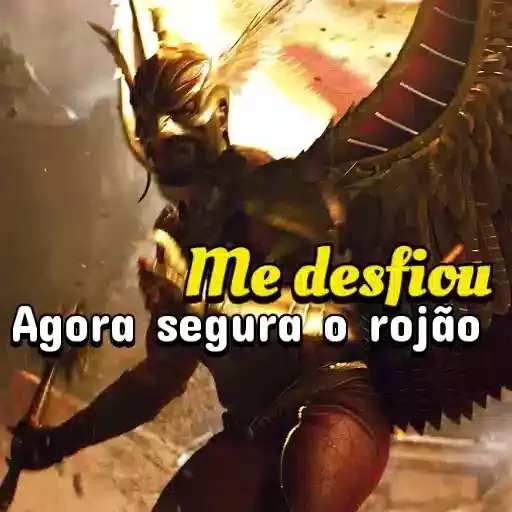 Uma figura sombria com chifres e asas escuras, em meio a uma explosão de fogo, com o texto 'Me desfiou' em amarelo e 'Agora segura o rojão' em branco.