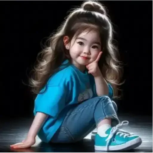 Menina loira sentada com um dedo no rosto, vestindo uma camiseta azul, jeans e tênis azuis. Ela está com um olhar pensativo.