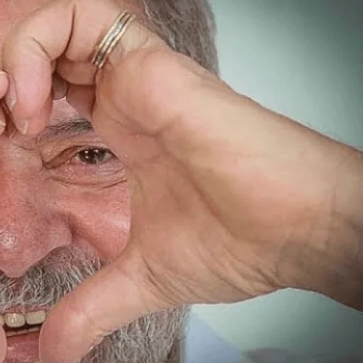 Um homem com bigode grisalho e um anel de metal no dedo indicador direito fazendo um gesto com a mão perto do olho.