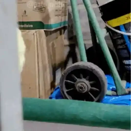 Uma imagem desfocada de um carrinho de mão com uma roda preta e uma estrutura verde, com caixas ao fundo.