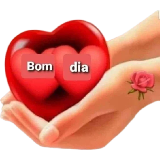 Mãos segurando dois corações vermelhos com as palavras 'Bom dia' escritas no centro, uma rosa tatuada no pulso.