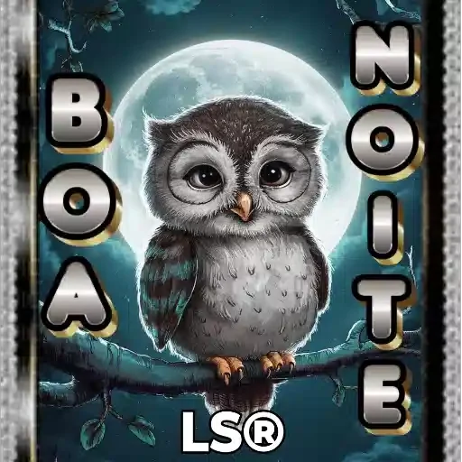Um desenho de uma coruja cinza com olhos grandes e penas marrons sentada em um galho em frente à lua cheia. A imagem tem as palavras 'BOA NOITE' escritas ao lado e 'LS®' embaixo.