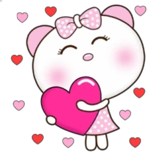 Um desenho de um personagem fofinho com uma cabeça redonda e orelhas de gato, vestindo um vestido rosa com manchas brancas e um laço rosa no cabelo, abraçando um coração rosa grande. O personagem tem bochechas rosadas e olhos fechados, e há vários corações pequenos ao redor.