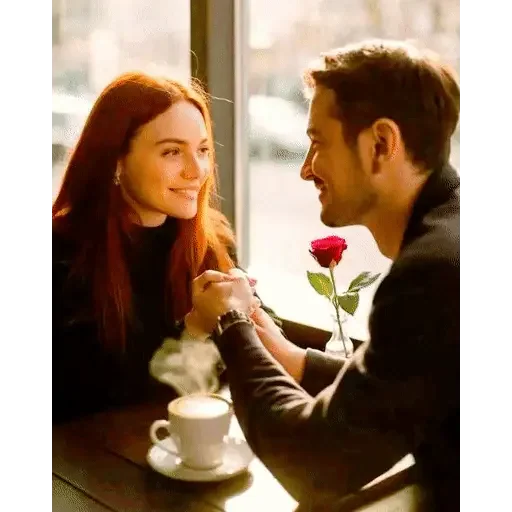 Casal sentado à mesa, com uma xícara de café e um buquê de rosa vermelha. O homem segura a mão da mulher e olha para ela com carinho.